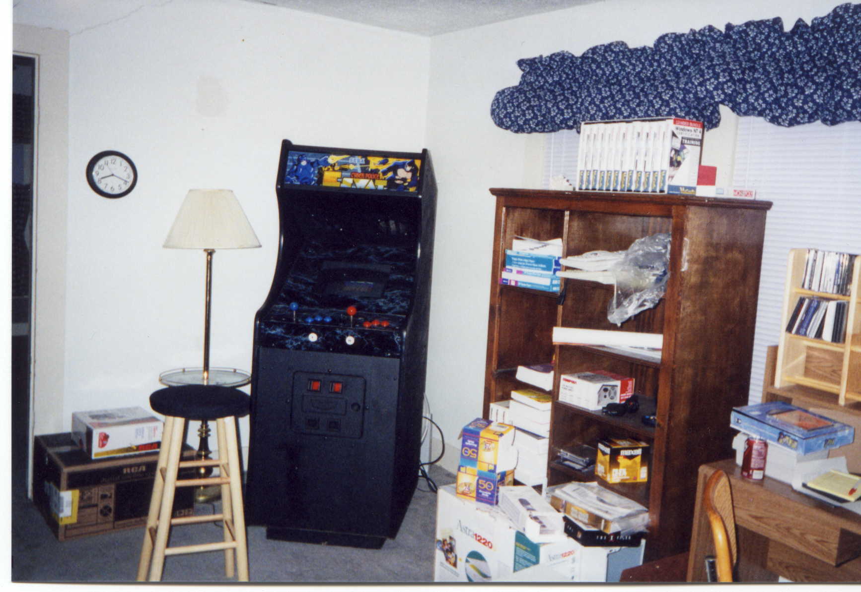The cabinet is an Eswat machine originally purchased at an auction for $75.  I gutted everything, replaced the monitor with a 15 inch CompUsa monitor, and mounted it with self brackets bolted into the monitor case (had the take the monitor apart of course to find a safe place to mount the bolts).
