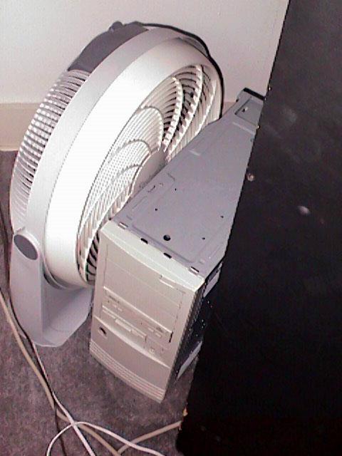 The cpu is a pII 350 with 32 megs of ram running Arcade@Home.  As you can see from the picture, the computer has a small heat problem so I have a floor fan keeping it cool (Hey, whatever works, huh?)
