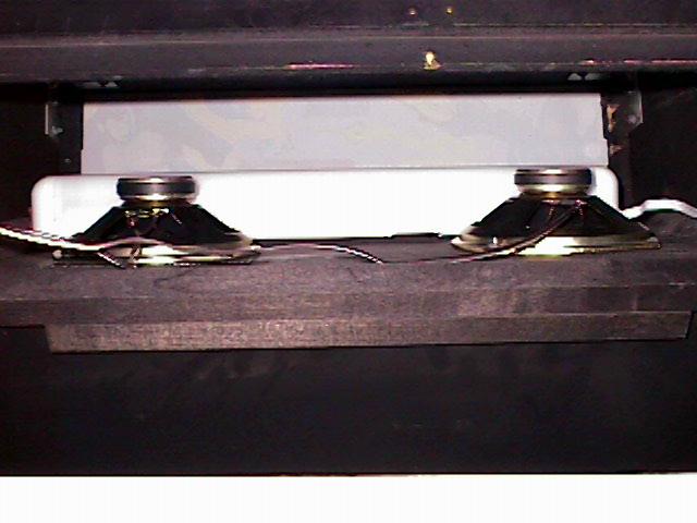 The cabinet came with only one speaker.  That has since been replaced with cheapo Radio Shack brand car stereo speakers.  The speakers are then hooked up to an old 8 track radio(!) inside (The radio has an aux. input, so I ran the computer's sound through that radio.  I know - it doesn't seem like the most practical thing to do - but i wanted to use the same speaker size that fit the cabinet) Click for a larger view!