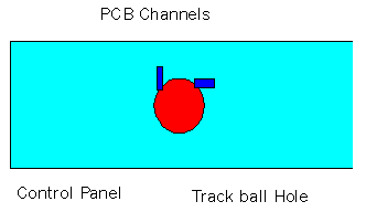 The board for the track ball is about 5” long and 3 ½ inches wide.  The ball ‘rests’ on the rollers for the PCB’s.